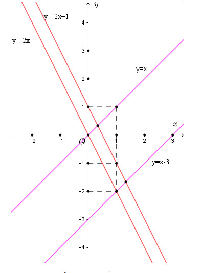 Giải bài tập a) Vẽ đồ thị các hàm số y = x, y = x – 3, y = -2x, y = – 2x + 1 trên cùng một mặt phẳng tọa độ.