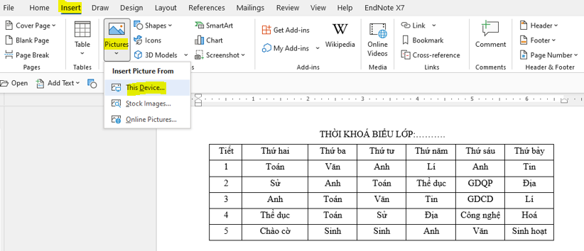 Chèn ảnh vào bảng: Nháy chuột vào vị trí muốn chèn ảnh => Trong thẻ Insert, chọn Picture => This Devide… (Tải ảnh từ máy tính lên) => Chọn ảnh muốn chèn => OK.