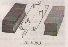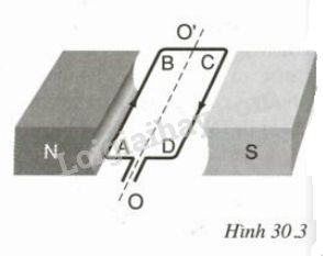 Hình 30.3 mô ta khung dây dẫn ABCD (có thể quay quanh trục OO’) có dòng điện chạy qua đặt trong từ trường, chiều của dòng điện và tên các cực của nam châm đã chỉ rõ trên hình.