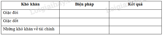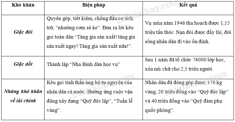 Hoàn thành bảng thống kê về những biện pháp mà Đảng và Chính Phủ đã thực hiện để giải quyết nạn đói, nạn dốt và những khó khăn về tài chính.