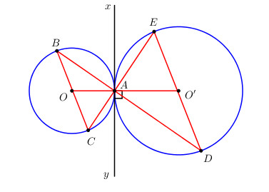 Xét đường tròn \(\left( {O’} \right)\) ta có: \(\widehat {ADE} = \widehat {EAx}\) (góc nội tiếp và góc tạo bởi tiếp tuyến và dây cing cùng chắn cung AE).