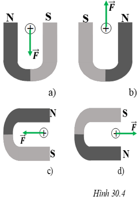 Một nam châm hình chữ U và một dây dẫn thẳng được bố trí như hình 30.4.a, b, c và d. Dòng điện trong dây dẫn có phương vuông góc với mặt phẳng trang giấy, chiều đi từ phía trước ra phía sau trang giấy. Hỏi trường hợp nào lực điện từ tác dụng vào dây dẫn hướng thẳng đứng lên trên?
