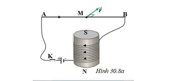 Xác định phương và chiều của lực điện từ tác dụng vào điểm M trên đoạn dây dẫn AB khi đóng công tắc K trên hình 30.8.