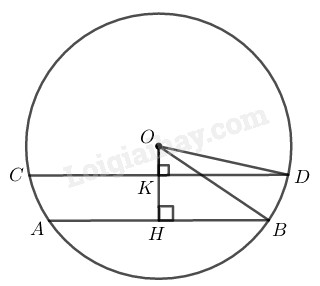Xét (O) có \(OK \bot CD\) mà OK là 1 phần đường kính và CD là dây cung \(\Rightarrow CK = DK = \displaystyle {1 \over 2}CD\) (đường kính vuông góc với một dây thì đi qua trung điểm của dây ấy)