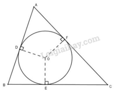 a) Tam giác \(ABC\) ngoại tiếp đường tròn tâm \(O\) nên \(AB,\ BC,\ AC\) lần lượt là tiếp tuyến tại \(D,\ E,\ F\) của đường tròn.