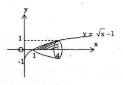 Cho hình phẳng \(A\) giới hạn bởi các đường \(y = 0, x = 4\), và \(y = \sqrt x  – 1\). Tính thể tích của khối tròn xoay tạo thành khi quay hình \(A\) quanh trục hoành.