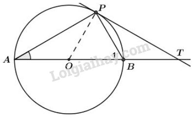 Cho đường tròn tâm \(O\) đường kính \(AB\). Một tiếp tuyến của đường tròn tại \(P\) cắt đường thẳng \(AB\) tại \(T\) (điểm \(B\) nằm giữa \(O\) và \(T\))