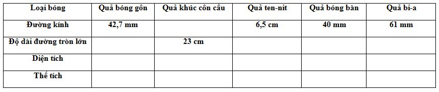 Các loại bóng cho trong bảng đều có dạng hình cầu. Hãy điền vào các ô trống ở bảng sau (làm tròn kết quả đến chữ số thập phân thứ hai):