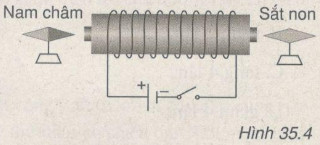 Trong thí nghiệm ở hình 35.4, khi đổi chiều dòng điện chạy vào cuộn dây dẫn thì tác dụng từ của cuộn dây đối với kim nam châm và kim sắt non có gì khác không? Vì sao?