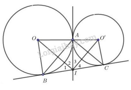 Cho hai đường tròn \((O)\) và \((O’)\) tiếp xúc ngoài tại \(A\). Kẻ tiếp tuyến chung ngoài \(BC\), \(B\in (O),C\in (O’).\) Tiếp tuyến chung trong tại \(A\) cắt tiếp tuyến chung ngoài \(BC\) ở \(I\).