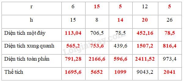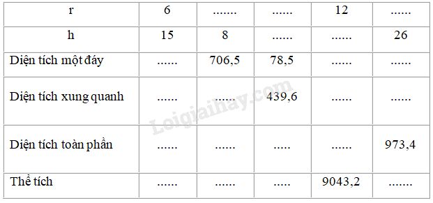 Quan sát hình trụ ở hình bs.30 rồi điền số thích hợp vào ô trống trong bảng sau (lấy \(\pi  = 3,14\))