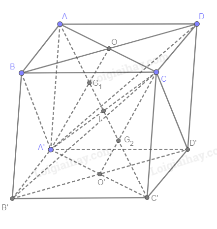 c) G1 và G2 là trọng tâm của hai tam giác BDA’ và B’D’C nên \(A{G_1} = \frac{2}{3}AI,{G_1}I = \frac{1}{3}AI\) và \(C'{G_2} = \frac{2}{3}C’I,{G_2}I = \frac{1}{3}CI\)