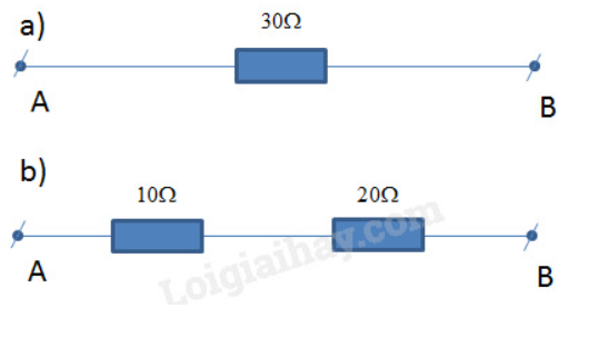 + Cách thứ hai là mắc hai điện trỏ’ \(R = 10Ω\) và \(R = 20Ω\) nối tiếp nhau trong đoạn mạch.