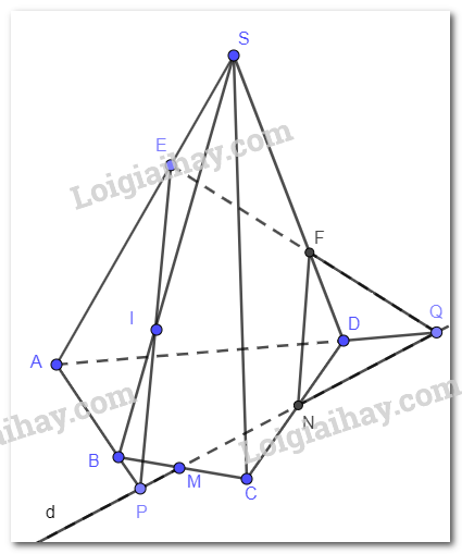 Cho hình chóp tứ giác S.ABCD và lấy một điểm E thuộc cạnh SA của hình chóp (E khác S, A).Trong mặt phẳng (ABCD) vẽ một đường thằng d cắt các cạnh CB, CD lần lượt tại M, N và cắt các tia AB, AD lần lượt tại P, Q.