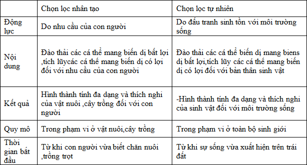 Trình bày sự khác biệt giữa chọn lọc tự nhiên và chọn lọc nhân tạo.