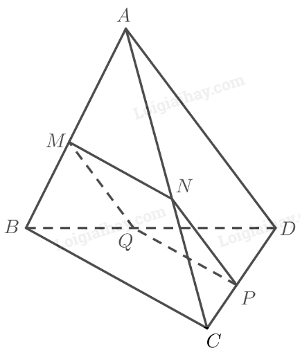 Cho tứ diện (ABCD) và điểm (M) thuộc cạnh (AB). Gọi (left( alpha right)) là mặt phẳng qua (M), song song với hai đường thẳng (BC) và (AD). Gọi (N,P,Q) lần lượt là giao điểm của mặt phẳng (left( alpha right)) với các cạnh (AC,CD) và (DB).
