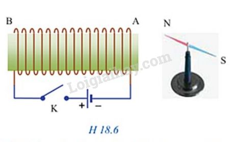 Đặt một kim nam châm trên giá đỡ ở phía trước đầu A của một ống dây dẫn như hình H18.6. Ban đầu khóa K mở. Đóng khóa K để ống dây dẫn trở thành một nam châm. Dùng quy tắc nắm tay phải hoặc một quy tắc khác, hãy xác định đầu A của ống dây là cực từ gì. Từ đó cho biết các cực từ N và S của kim nam châm, cực nào quay về phía đầu A, cực nào quay ra xa đầu A của ống dây.