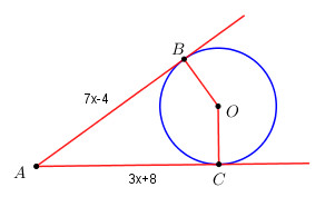 \(\begin{array}{l}AB = AC \Leftrightarrow 7x – 4 = 3x + 8\\ \Leftrightarrow 4x = 12 \Leftrightarrow x = 3\end{array}\).