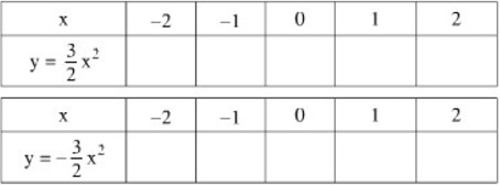 Cho hai hàm số: \(y = \dfrac{3}{2}{x^2},y =  – \dfrac{3}{2}{x^2}\). Điền vào những ô trống của các bảng sau rồi vẽ hai đồ thị trên cùng một mặt phẳng tọa độ.