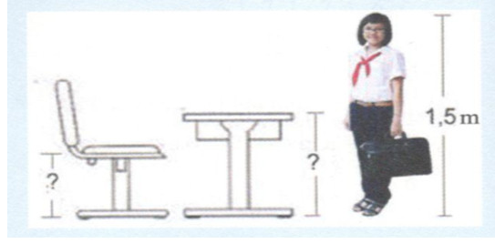 Em hãy tính xem, với một học sinh cao 1,5m như trong hình thì chiều ao ghế và chiều cao bàn là bao nhiêu thì thích hợp. Kết quả được ghi dưới dạng phân số.