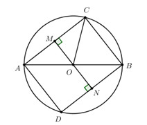 Cho đường tròn (O) đường kính AB. Qua A và B vẽ hai dây song song AC và BD (điểm C và D nằm trên đường tròn). Gọi M, N lần lượt là hình chiếu vuông góc của O xuống AC và BD.