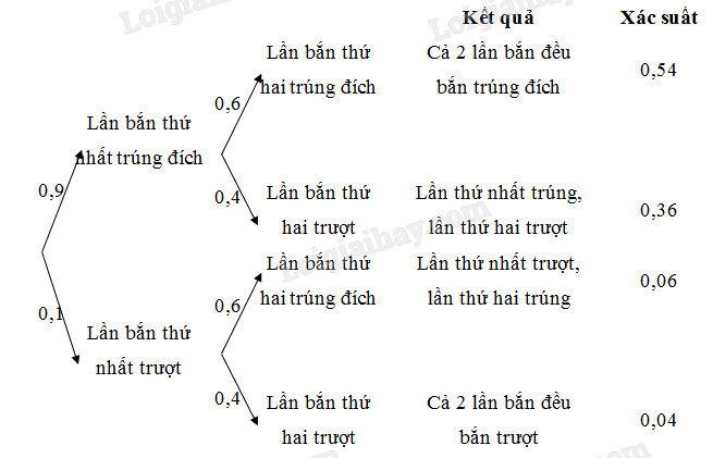 Một xạ thủ bắn lần lượt 2 viên đạn vào một bia. Xác suất trúng đích của viên thứ nhất và thứ hai lần lượt là 0,9 và 0,6. Biết rằng kết quả các lần bắn là độc lập với nhau. Tính xác suất của các biến cố sau bằng cách sử dụng sơ đồ hình cây: