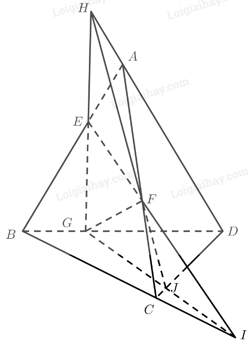 Cho tứ diện \(ABCD\). Gọi \(E,F,G\) lần lượt là ba điểm trên ba cạnh \(AB,AC,BD\) sao cho \(EF\) cắt \(BC\) tại \(I\left( {I \ne C} \right)\), \(EG\) cắt \(A{\rm{D}}\) tại \(H\left( {H \ne D} \right)\).
