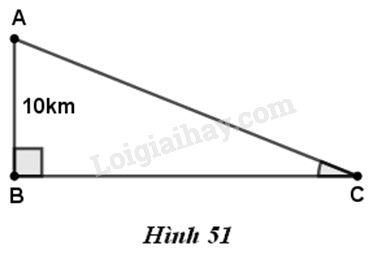 a) Trong tam giác vuông \(ABC,\) khi \(\widehat C = {3^o}\) thì \(AC = \dfrac{{AB}}{{\sin \widehat {ACB}}}\)\( = \dfrac{{10}}{{\sin {3^o}}} \approx 191,073\left( {km} \right).\)