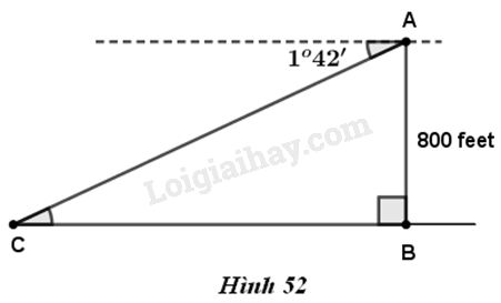 Giả sử A là đài hải đăng nơi người quan sát đứng nhìn thấy tàu; \(B\) là chân của đài hải đăng ở mặt nước biển ; \(C\) là vị trí con tàu trên mặt biển. Ta có tam giác vuông \(ABC\); \(C\) là vị trí con tàu trên mặt biển. Ta có tam giác vuông \(ABC\) với \(\widehat C = {1^o}42′;AB = 800\) feet. Do đó khoảng cách \(BC\) từ tàu đến chân đài hải đăng là :