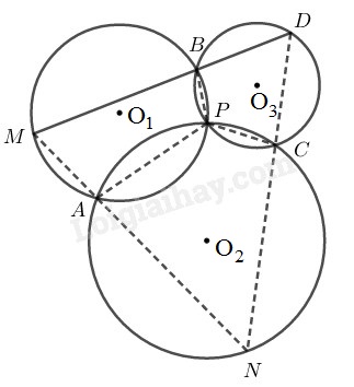 Cho ba đường tròn cùng đi qua một điểm \(P.\) Gọi các giao điểm khác \(P\) của hai trong ba đường tròn đó là \(A, B, C.\) Từ một điểm \(D\) (khác điểm \(P\)) trên đường tròn \((PBC)\) kẻ các tia \(DB, DC\) cắt các đường tròn \((PAB)\) và \((PAC)\) lần lượt tại \(M, N.\) Chứng minh ba điểm \(M, A, N\) thẳng hàng.