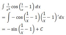 Do đó \(\int {{1 \over {{x^2}}}} \cos \left( {{1 \over x} – 1} \right)dx =  – \int {\cos udu}\) \( =  – \sin u + C =  – \sin \left( {{1 \over x} – 1} \right)  + C\)