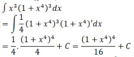 \(\int {{x^3}{{\left( {1 + {x^4}} \right)}^3}dx}= {1 \over 4}\int {{u^3}du} \) \(= {{{u^4}} \over {16}} + C \) \(= {1 \over {16}} {\left( {1 + {x^4}} \right)^4} + C\)