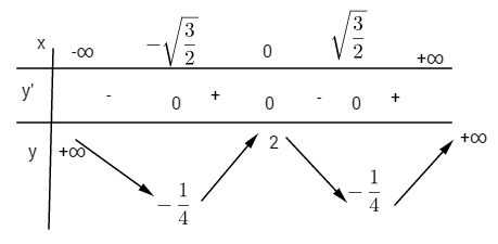 \(y\left( 0 \right) = 2\) và \(y\left( { \pm \sqrt {{3 \over 2}} } \right) = – {1 \over 4}\)