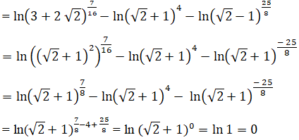 \({7 \over {16}}\ln \left( {3 + 2\sqrt 2 } \right) – 4\ln \left( {\sqrt 2  + 1} \right) – {{25} \over 8}\ln \left( {\sqrt 2  – 1} \right) = 0\)