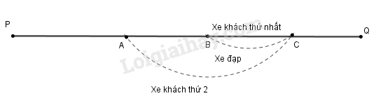 Giả sử khi xe khách thứ nhất vượt người đi xe đạp tại điểm \(B\) thì xe khách thứ hai ở điểm \(A\) như hình vẽ.