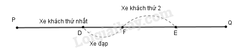 Giả sử người đi xe đạp gặp xe khách thứ nhất đi ngược chiều tại điểm \(D\) thì xe khách thứ hai đi ngược chiều  đang ở vị trí \(E\) như hình vẽ.