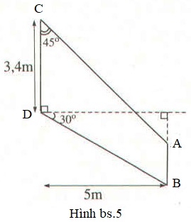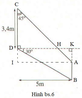 Đường thẳng \(AB\) cắt \(DH\) tại \(K\) thì \(DK = 5m\) nên \(H\) nằm ở giữa \(D\) và \(K\) (xem Hình bs.6).