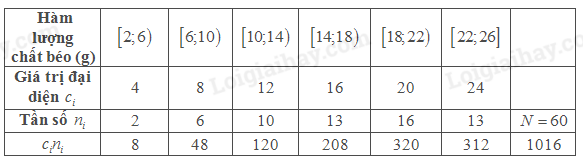 b) Hàm lượng chất béo trung bình của 60 loại thực phẩm là \(16,9g\)