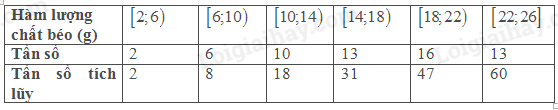 Mai tìm hiểu lượng hàm chất béo (đơn vị: g) có trong 100g mỗi loại thực phẩm. Sau khi thu thập dữ liệu về 60 loại thực phẩm, Mai lập được bảng thống kê 5.38.