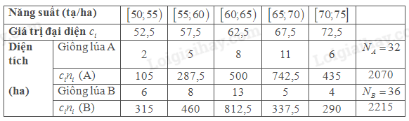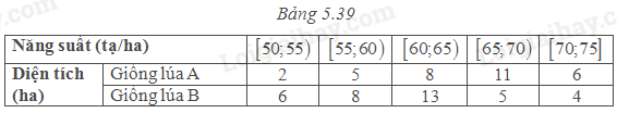 Một công ty giống cây trồng đã cho trồng thử nghiệm hai giống lúa vụ đông xuân ở một số địa phương, với điều kiện thổ nhưỡng và chế độ chăm sóc như nhau. Cuối vụ, công ty tìm hiểu năng suất mỗi giống lúa trên những thửa ruộng đã trồng thí điểm và thu được dữ liệu ở bảng sau: