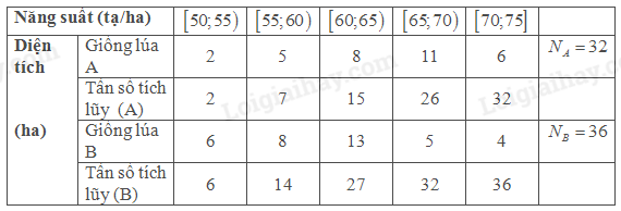 * Với giống lúa \(B\) có \(\frac{{{N_B}}}{2} = \frac{{36}}{2} = 18\). Do đó nhóm có tần số tích lũy lớn hơn hoặc bằng 18 là nhóm \(\left[ {60;65} \right)\).