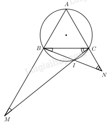 Cho đường tròn tâm \(O\) bán kính \(R.\) Lấy \(3\) điểm \(A, B, C\) trên đường tròn đó sao cho \(AB = BC = CA.\) Gọi \(I\) là điểm bất kỳ của cung nhỏ \(BC\) \((\)và \(I\) không trùng với \(B, C).\) Gọi \(M\) là giao điểm của \(CI\) và \(AB.\) Gọi \(N\) là giao điểm của \(BI\) và \(AC.\) Chứng minh: