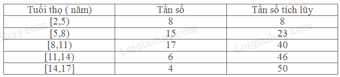 a, Bảng tần số tích lũy bao gồm 3 cột: cột 1 là tuổi thọ, cột 2 là tần số, cột 3 là cột tần số tích lũy. Trong đó, tần số tích lũy bằng tần số của nhóm đó cộng với tần số của nhóm đứng trước đó.