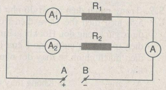 Cho mạch điện có sơ đồ hình 5.3, trong đó R1=20Ω, R2=30Ω, ampe kế chỉ 1,2A. Tính số chỉ của các ampe kế A1 và A2.