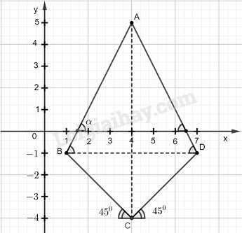 Trên mặt phẳng Oxy cho bốn điểm A, B, C, D có tọa độ nguyên như sau: \(A (4 ; 5)\), \(B (1 ; -1)\), \(C (4 ; -4)\), \(D (7 ; -1)\).