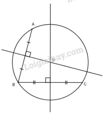 – Dựng các đường trung trực của \(AB,\ AC\) chúng cắt nhau tại \(O\), khi đó \(O\) là tâm của đường tròn ngoại tiếp tam giác \(ABC\). Hay \(O\) là tâm của tấm bìa hình tròn.