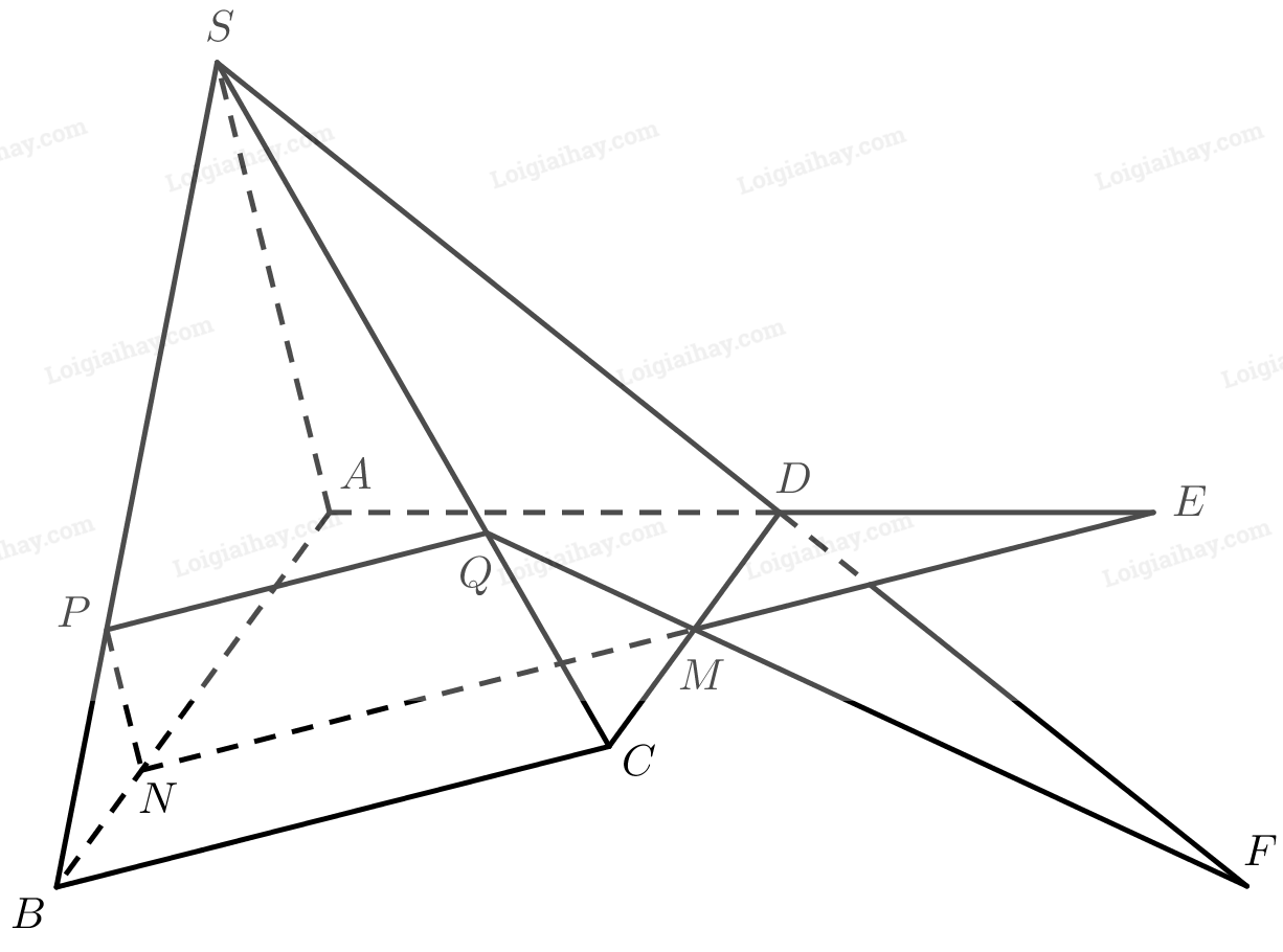 Gọi \(E\) là giao điểm của \(A{\rm{D}}\) và \(MN\), \(F\) là giao điểm của \(S{\rm{D}}\) và \(MQ\). Ta có: