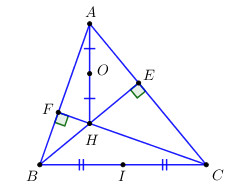 \(\Delta AFH\) vuông tại \(F \Rightarrow OF = \dfrac{1}{2}AH = OA = OH\,\,\left( 4 \right)\) (trong tam giác vuông, trung tuyến ứng với cạnh huyền bằng nửa cạnh ấy).