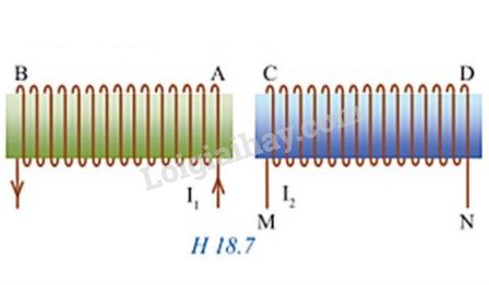 Hai ống dây dẫn có dòng điện chạy qua đặt gần nhau như mô tả ở hình H18.7 và hai đầu A, C của hai ống dây hút nhau. Hãy cho biết dòng điện I2 chạy trong ống dây II có chiều từ M đến N hay từ N đến M.