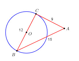 Ở hình dưới, biết AB = 9, BC = 12, AC = 15 và BC là đường kính của đường tròn (O). Chứng minh AB là tiếp tuyến của đường tròn (O).